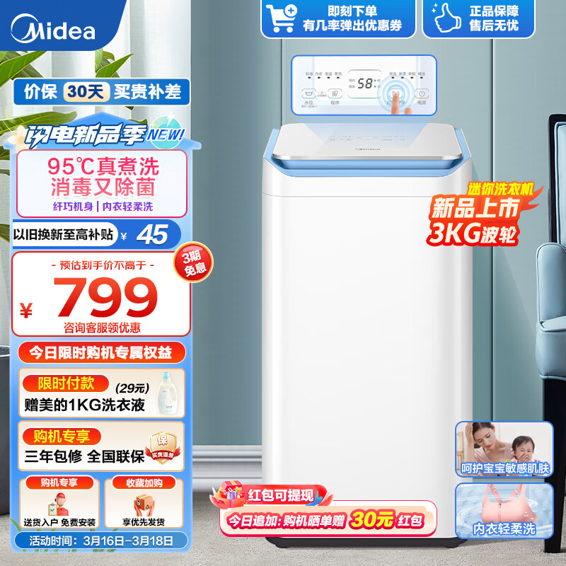 美的(Midea)波轮洗衣机全自动 3公斤迷你洗衣机小型儿童洗衣机婴儿洗衣机内衣洗衣机高温煮洗MB30VH10E Pro 升级款VH10E Pro价格:799.00元!