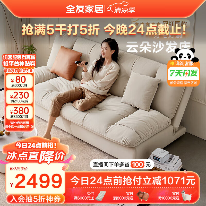 全友家居 猫抓绒布沙发现代简约云朵直排小户型沙发床客厅家具111039价格:3570.00元!