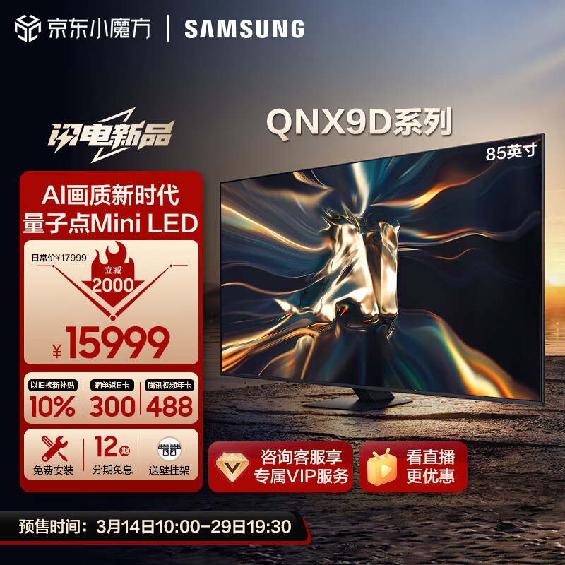 三星(SAMSUNG)85QNX9D 85英寸 Neo QLED量子点 Mini LED电视 超薄4K 120Hz高刷 HDMI2.1 QA85QNX9DAJXXZ价格:15999.00元!