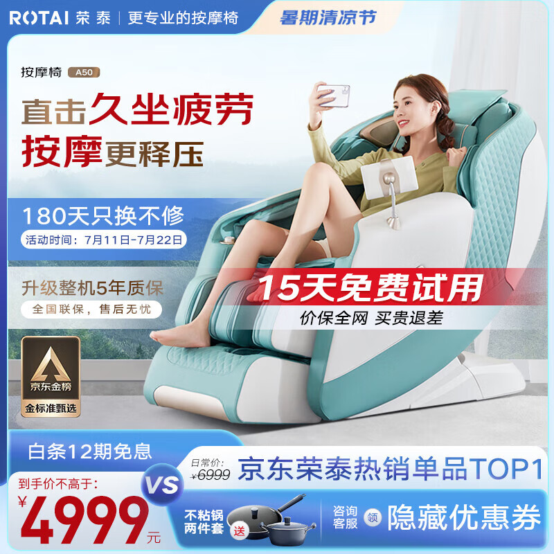 荣泰(RONGTAI) 按摩椅2024十家用全身太空舱零重力多功能智能电动按摩沙发椅子生日礼物 A50 苹果绿价格:10999.00元!