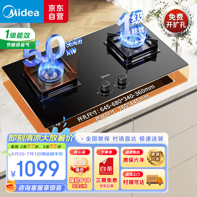 美的(Midea)燃气灶 大火力家用灶具 5.0kW猛火大火灶台嵌两用 JZT-Q523L-M 天然气价格:1099.00元!
