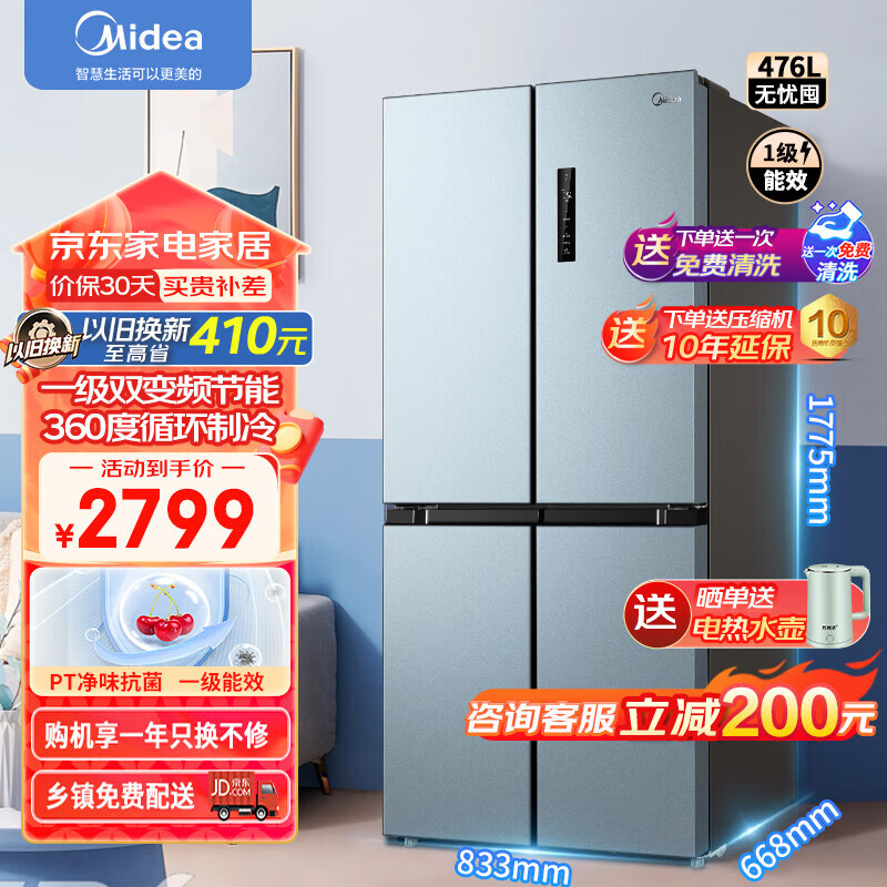 美的(Midea)冰箱476升四开门十字对开 家用大容量 双循环双变频 PT净味 超薄电冰箱BCD-476WSPZM(E)价格:2999.00元!