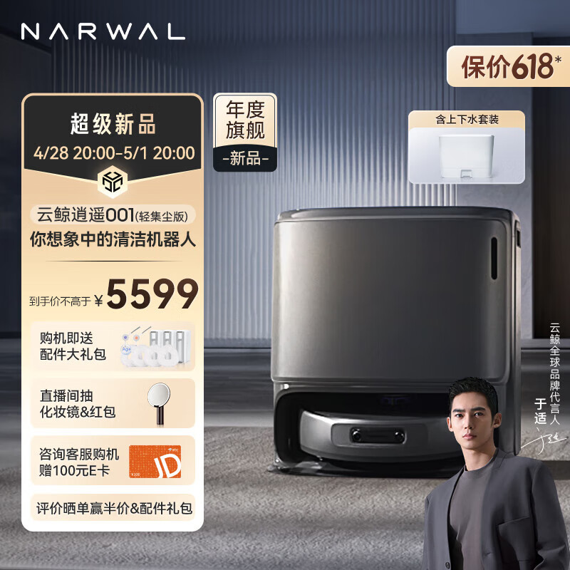 云鲸扫地机器人逍遥001轻集尘版 扫拖一体自动清洗拖布烘干 零缠绕双芯双目清洁擦地拖地机 上下水套装价格:5599.00元!