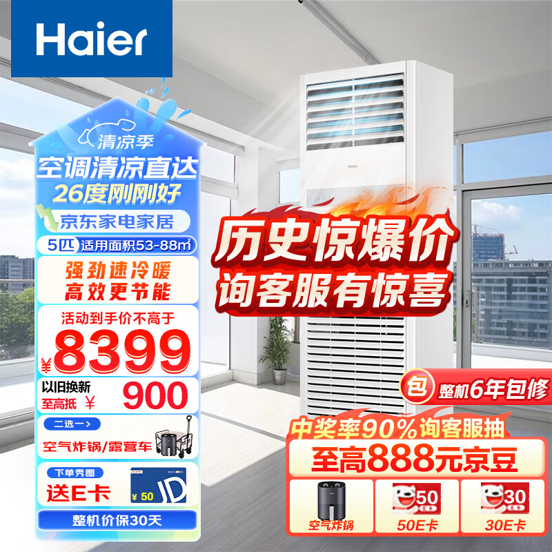 海尔(Haier)中央空调5匹柜式空调 商用柜机 变频冷暖二级能效KFRd-120LW/5YQF82 京配 包4米安装价格:8399.00元!
