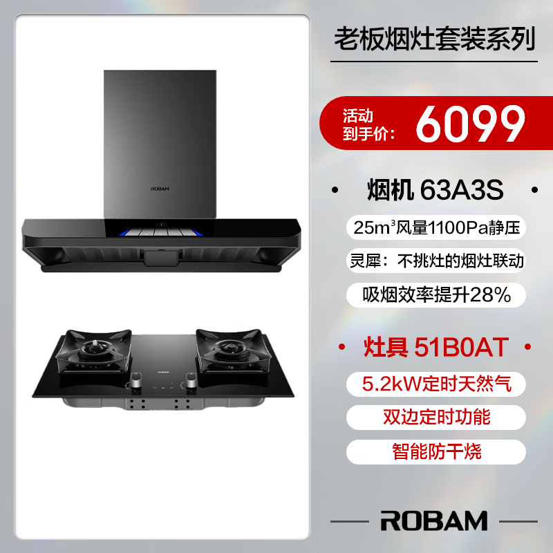 老板(Robam)【灵犀AI智能】顶吸变频25m3抽吸油烟机家用大吸力定时防干烧燃气灶烟灶套装63A3S+51B0A天然气价格:7999.00元!