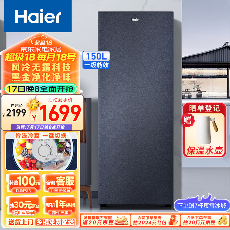 海尔(Haier)国瓷系列150升风冷家用立式冷藏冷冻柜抽屉式冷柜小冰柜家用小冰箱BD-150WGHB9D以旧换新价格:1699.00元!