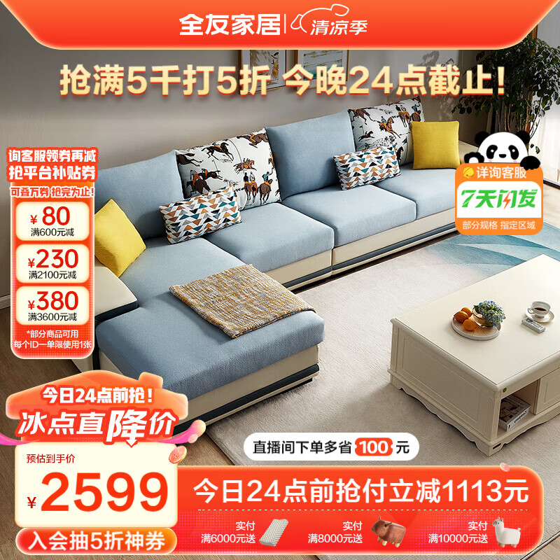 全友家居 现代简约家用大户型贵妃转角沙发客厅实木架布艺沙发102085价格:3712.86元!