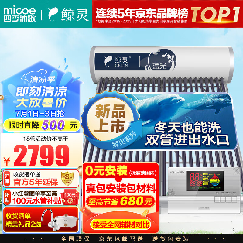 四季沐歌鲸灵系列太阳能热水器 家用全自动光电两用 双上下水口 一级能效 电热加热 18管140L 送货+安装价格:3299.00元!