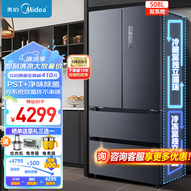 美的(Midea)法式四开门双系统双循冰箱大容量19分钟急速净味508升变频一级能效环多门BCD-508WTPZM(E)莫兰迪灰价格:4799.00元!