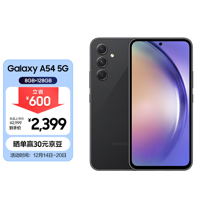 三星 SAMSUNG Galaxy A54 5G手机 大角度OIS光学防抖 IP67级防尘防水 5000mAh大电池 8GB+128GB 深岩黑价格:2399.00元!