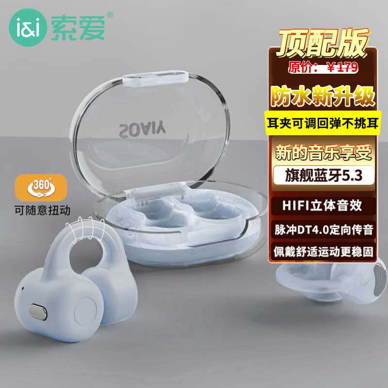 索爱(soaiy)蓝牙耳机夹耳式耳夹骨传导无线不入耳儿童带充电仓运动音乐高音质长续航不漏音 GK8远峰蓝价格:138.00元!