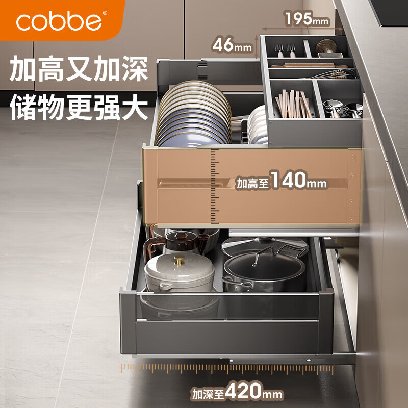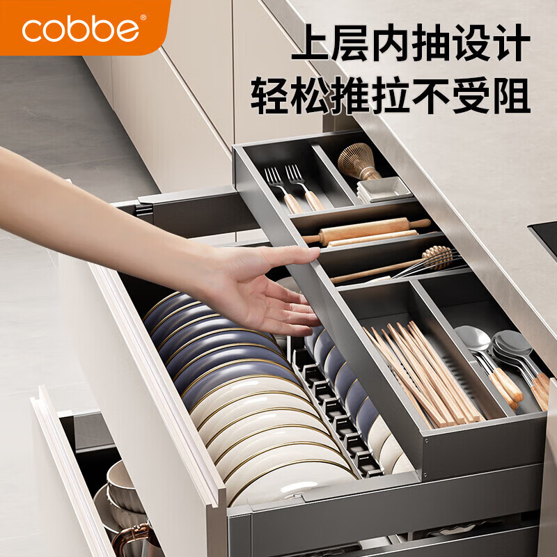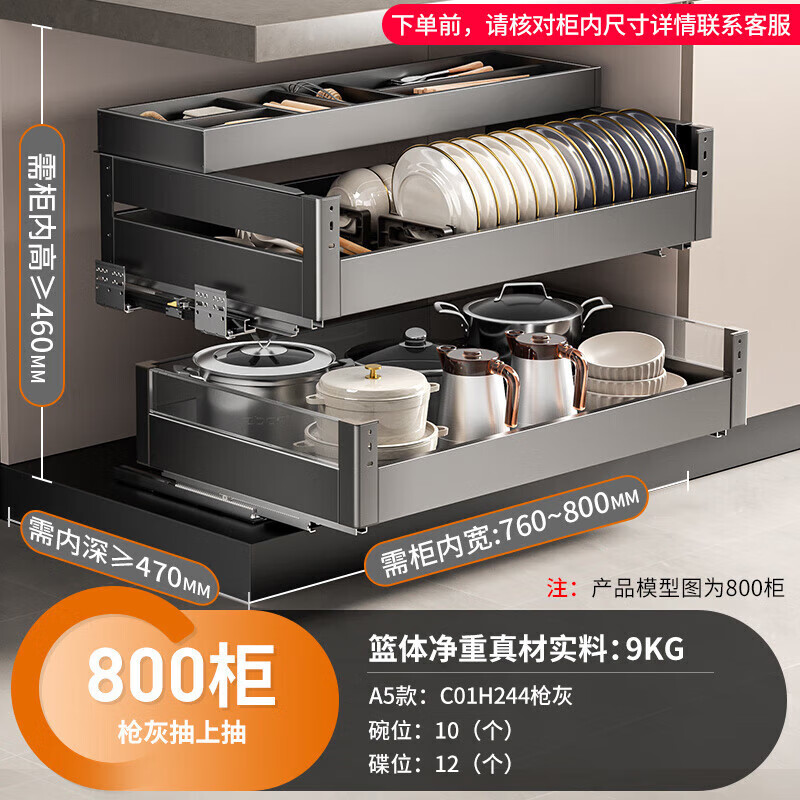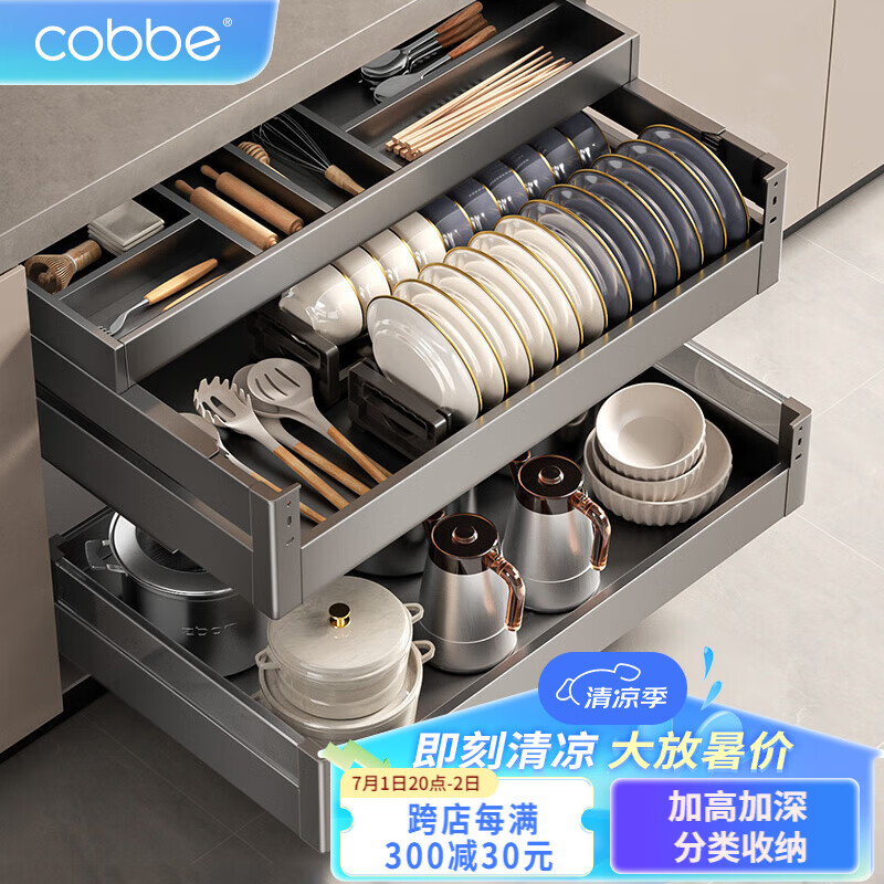 卡贝(cobbe)枪灰厨房拉篮橱柜抽屉式双层碗篮304不锈钢碗碟架置物架加深拉蓝价格:1108.00元!