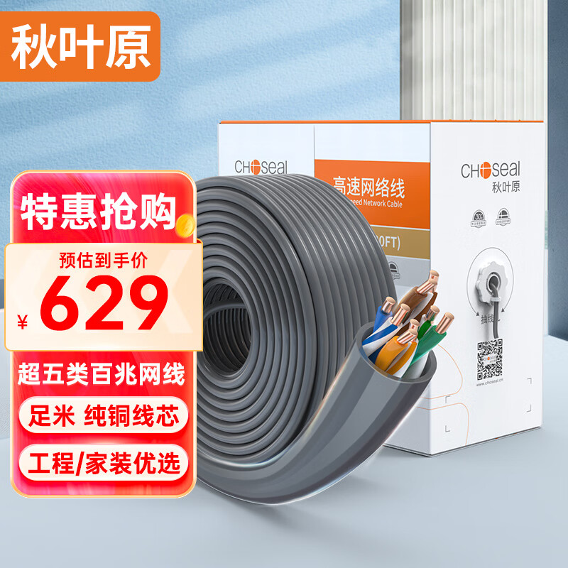 秋叶原(CHOSEAL)原装超五类网线【工程版】CAT5e纯铜线芯综合布线POE供电非屏蔽网络线灰色305米QS2608AT305S价格:659.00元!