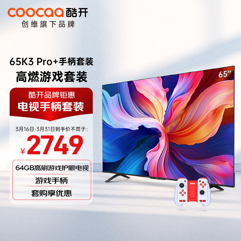 酷开创维 65英寸电视机K3 Pro+运动加加Gemini三合一手柄套装 游戏电视 家庭娱乐 高刷体验畅玩多平台价格:2749.00元!