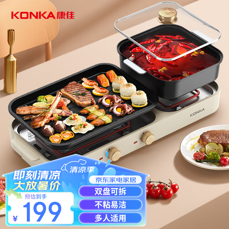 康佳(KONKA)电烧烤炉 烤肉锅 多功能电火锅涮烤一体锅家用电烤炉烤涮锅 双温控可分离 KSKG-1981-W价格:199.00元!