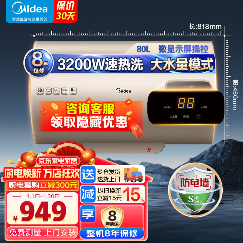 美的(Midea)电热水器80升大水量家用数显3200W储水式速热恒温防电墙租房卫生间沐浴上门安装F8032-P5(H)价格:948.00元!