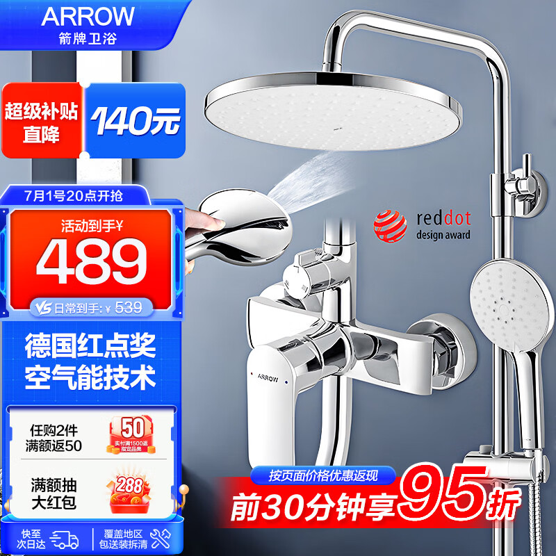 箭牌(ARROW)淋浴花洒套装 自洁淋浴喷头升级下出水 洗澡沐浴易洁手持顶喷 红点奖背喷花洒3354MS-P价格:629.00元!