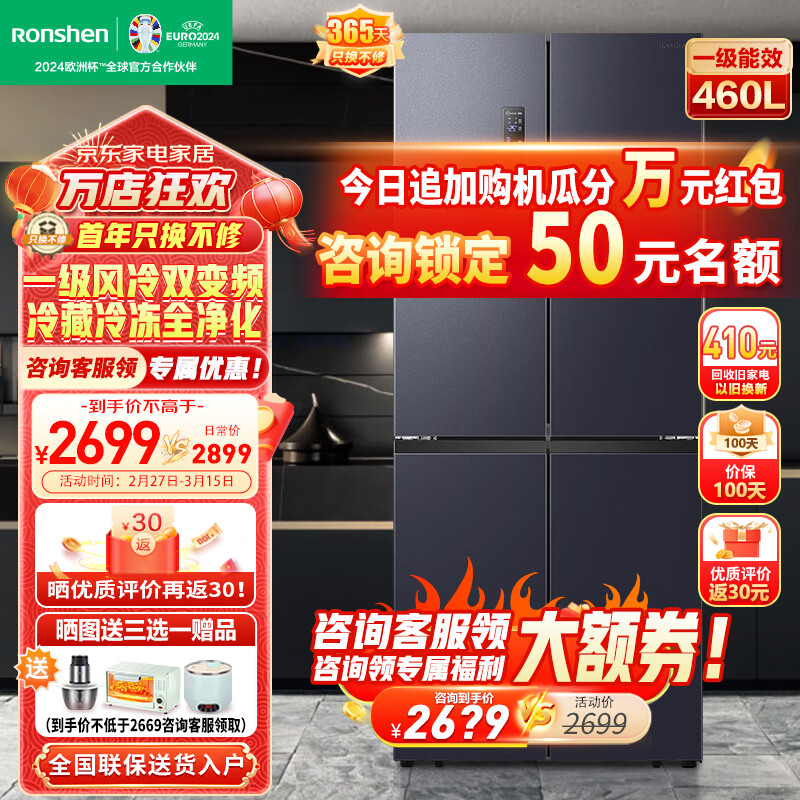 容声(Ronshen)460升十字对开门一级能效风冷无霜大容量超薄嵌入式四开门电冰箱BCD-460WD12FPA价格:2699.00元!