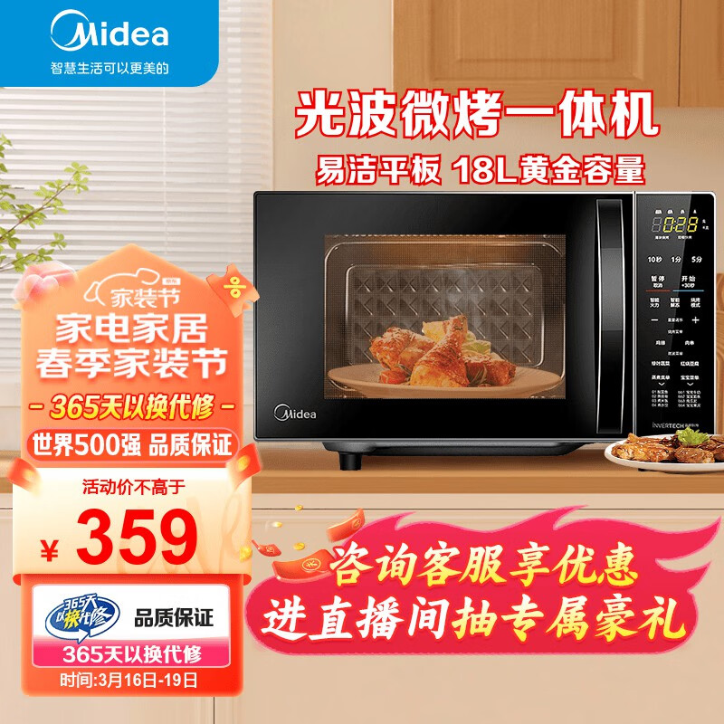 美的(Midea)微波炉烤箱一体机 光波炉 小型家用平板加热速热解冻烤肉烤蛋挞微烤一体机18升(M1-L201BM)价格:359.00元!