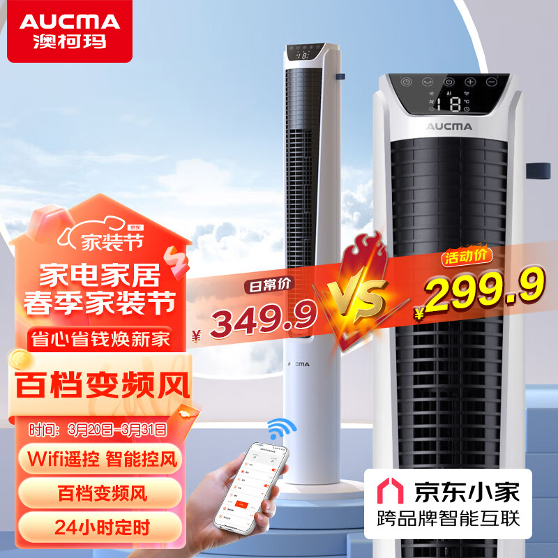 澳柯玛(AUCMA)京东小家智能生态/百档变频直流/办公室无叶风扇/塔式电风扇WiFi控制家用塔扇落地扇 X7价格:349.90元!