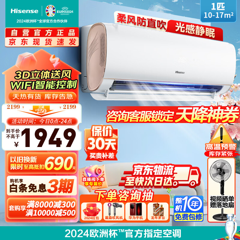 海信(Hisense)大1匹 速冷热 新一级大风量光感静眠变频柔风壁挂式卧室空调挂机 KFR-26GW/S510-X1以旧换新价格:1949.00元!