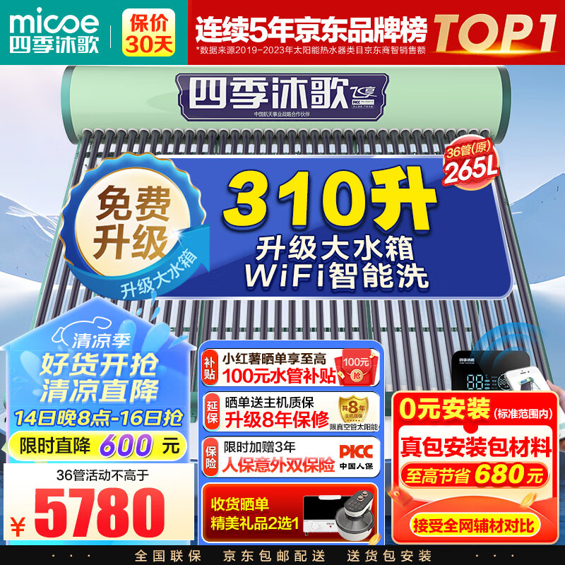 四季沐歌(MICOE)飞享WIFI智控太阳能热水器 家用光电两用 自动上水 带电加热 WiFi远程智控 36管265L送货+安装价格:6380.00元!