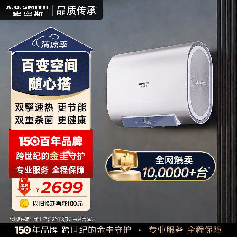 史密斯(A.O.SMITH)佳尼特60升电热水器 超薄双胆扁桶 金圭特护系统 双3kW速热 遥控 CTE-60HT1以旧换新价格:2699.00元!