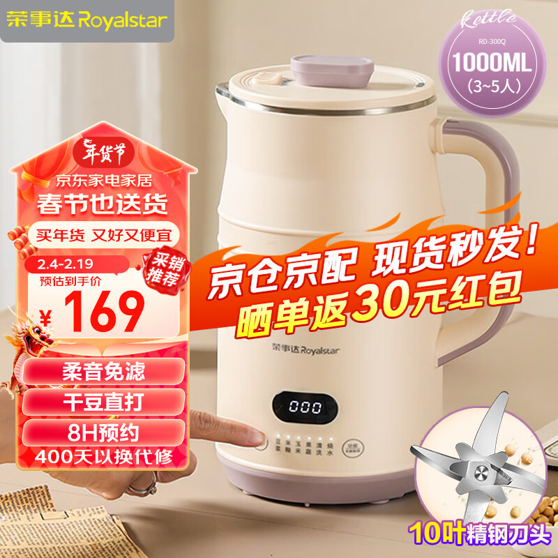 荣事达(Royalstar)豆浆机破壁家用免滤柔音全自动3-4人低音降噪多功能12叶钢刃榨汁料理机早餐机破壁机 RD-300Q价格:169.00元!
