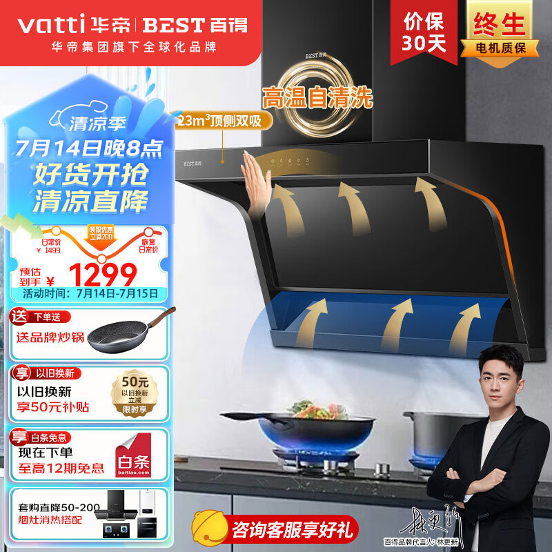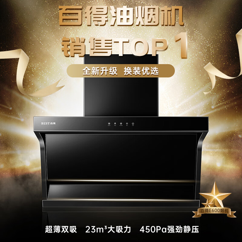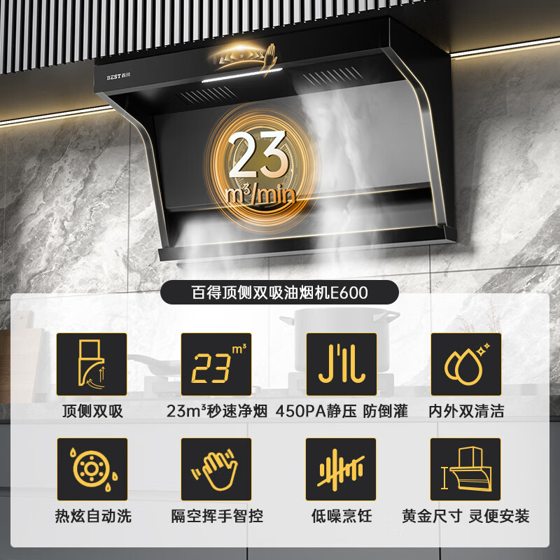 百得(BEST)华帝出品 顶侧双吸油烟机 家用7字型抽油烟机脱排23立方大吸力挥手感应自动洗 CXW-280-E600价格:1349.00元!