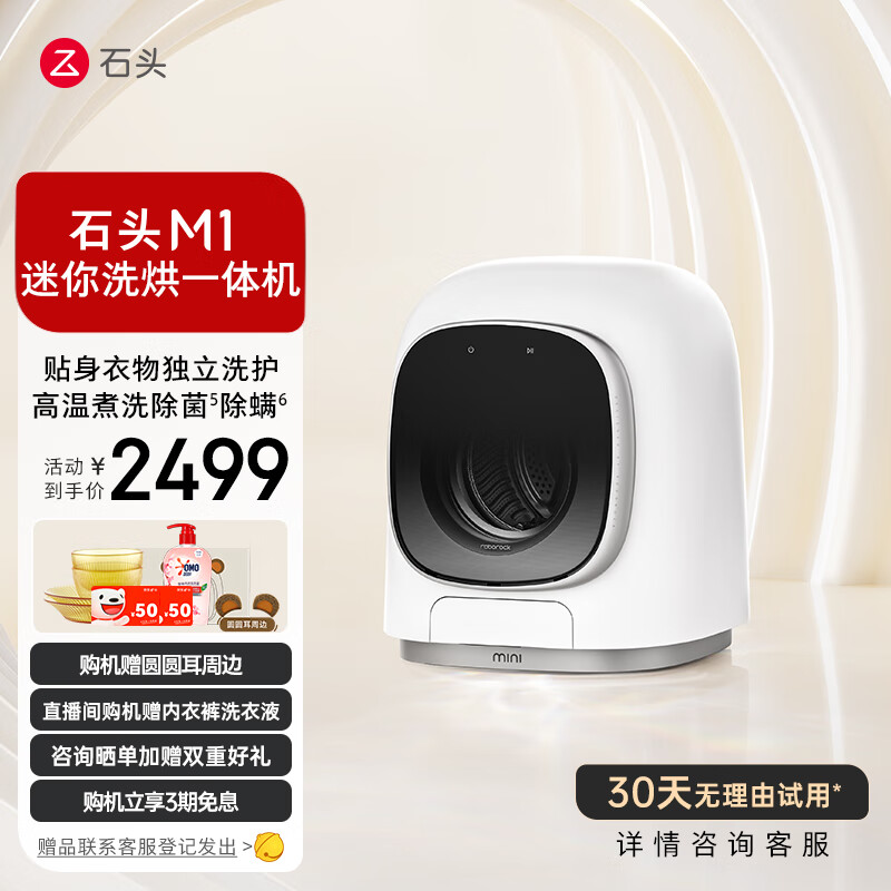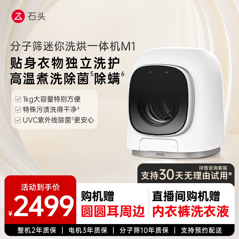 石头(roborock)分子筛迷你洗烘一体机M1 洗烘一体家用小型小尺寸1kg公斤滚筒儿童婴儿内衣全自动洗衣机 星月银 洗烘一体机价格:2499.00元!