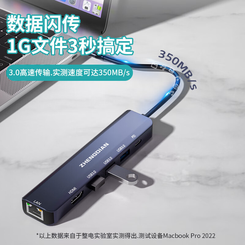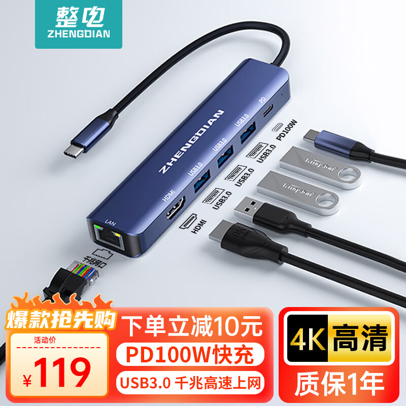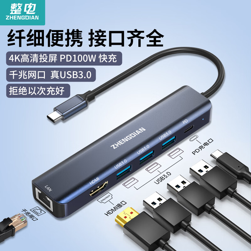 整电Type-C扩展坞千兆网线口拓展坞HDMI转接头USB-C适用苹果mac华为笔记本电脑USB3.0 带供电6合1 7HN6价格:129.00元!