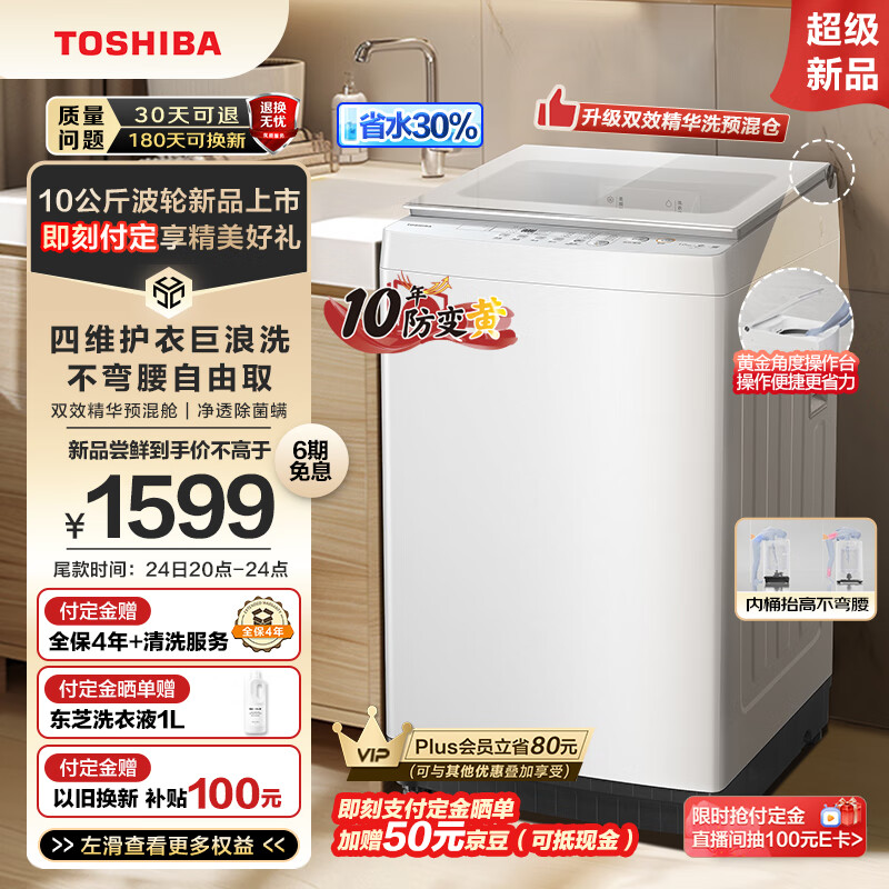 东芝(TOSHIBA)波轮洗衣机全自动 10公斤大容量白色 双效精华预混舱 银离子除菌螨 抗菌桶 以旧换新DB-10T06价格:1598.00元!