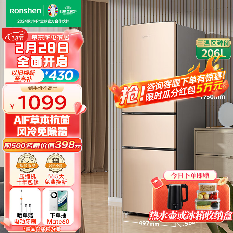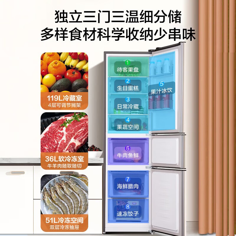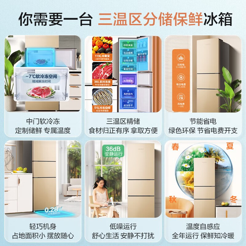 容声冰箱206升三开门中门软冷冻三温分储保鲜节能省电低噪家用租房宿舍小巧不占地BCD-206D11N价格:1199.00元!