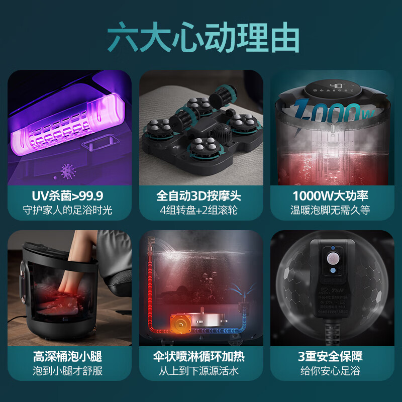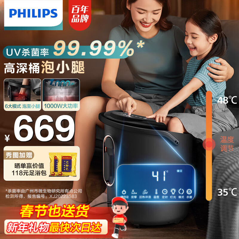 飞利浦(PHILIPS)泡脚桶加热全自动按摩足浴盆洗脚盆家用泡脚盆电动加热足浴高深桶生日礼物送老人父母亲长辈 【全新升级·智能杀菌】六大模式-5303F价格:779.00元!