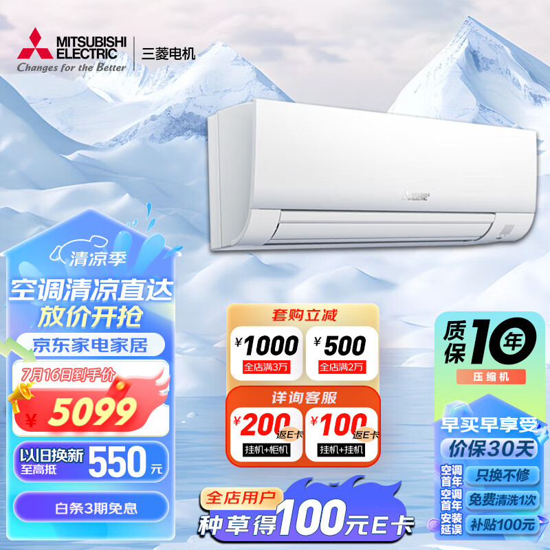 三菱电机10-15㎡适用 新二级 1匹 直流变频冷暖 家用舒适空调挂机 低噪轻音 壁挂式 以旧换新MSZ-TZ09VA价格:5199.00元!