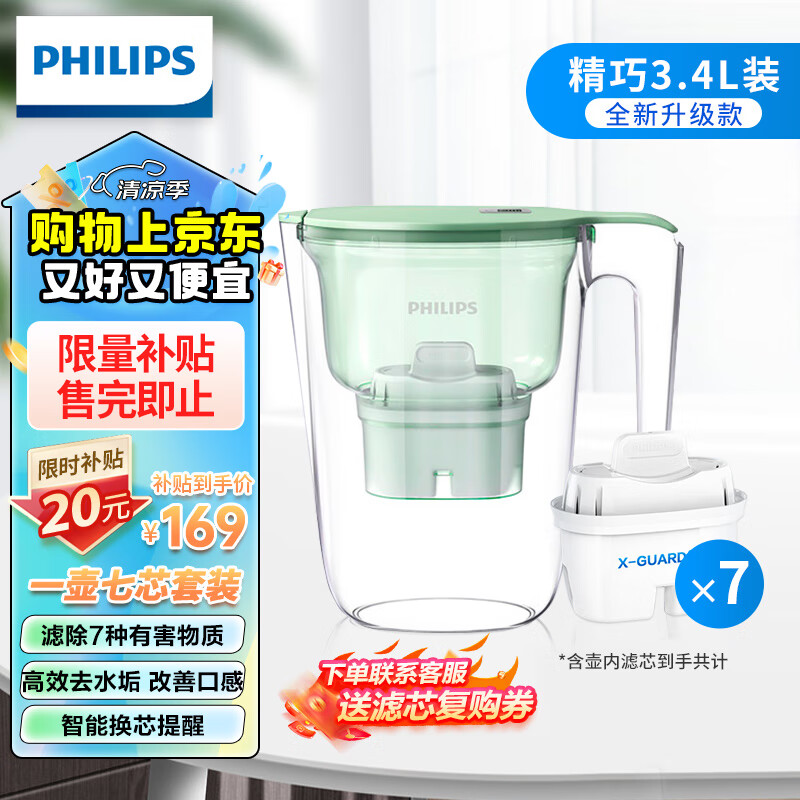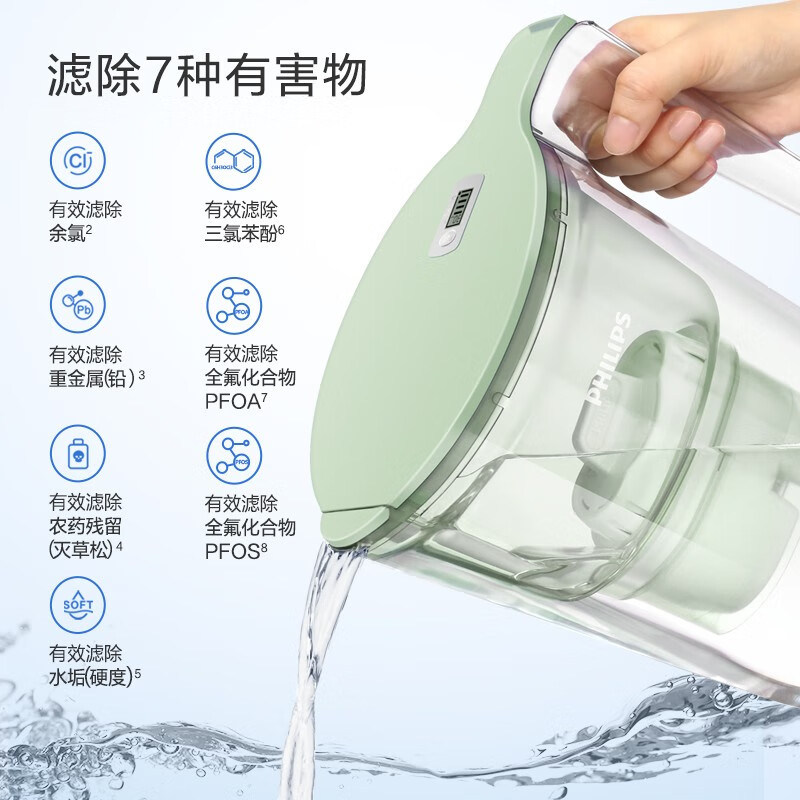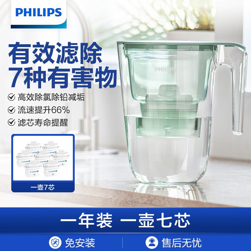 飞利浦(PHILIPS)全新升级净水壶 家用滤水壶 厨房自来水过滤净水器 AWP2813GNT 一壶7芯价格:189.00元!