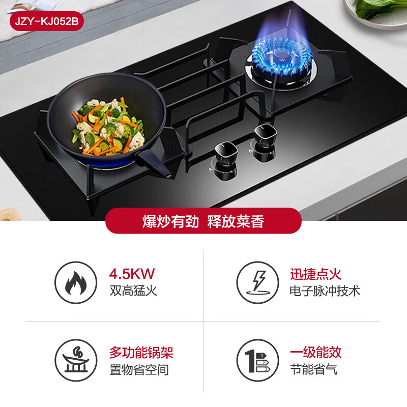 万家乐燃气灶 4.5kW双高猛火 一级能效钢化玻璃 燃气灶双灶 台嵌两用家用灶具 JZY-KJ052B液化气价格:499.00元!