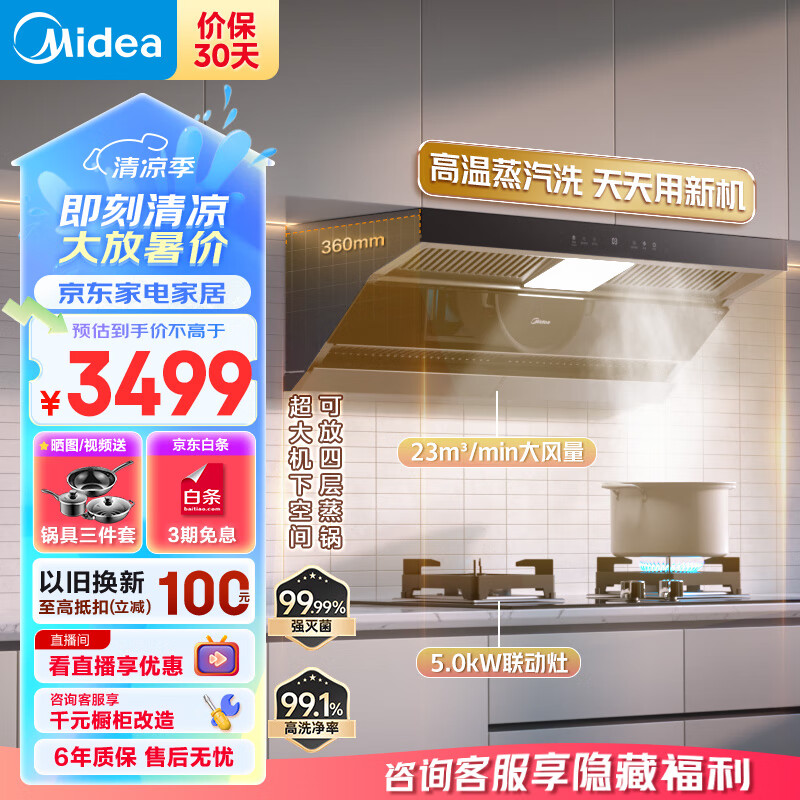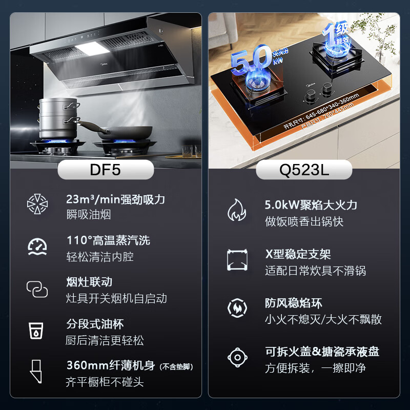 美的(Midea)抽油烟机 家用厨房顶侧双吸23吸力蒸汽洗 排油烟机烟灶联动套装DF5+Q523L天然气价格:3699.00元!