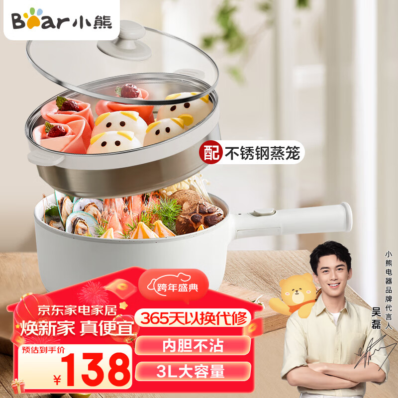 小熊(Bear)电煮锅 多用途多功电热锅 3L长手柄不粘锅 宿舍蒸煮小电锅 一体蒸屉电蒸锅 DRG-D30F9价格:99.00元!