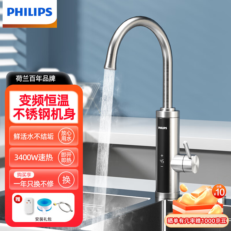 飞利浦(PHILIPS)电热水龙头 变频恒温不锈钢电热水龙头厨房即热式速热冷热两用阳台小厨宝电热水器AWH1023SS/93价格:399.00元!