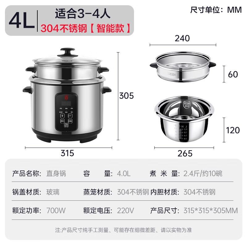 三角牌(Triangle) 电饭煲老式电饭锅不锈钢家用煮饭锅米饭锅带蒸笼家庭用 304不锈钢【智能款】 4L价格:229.00元!