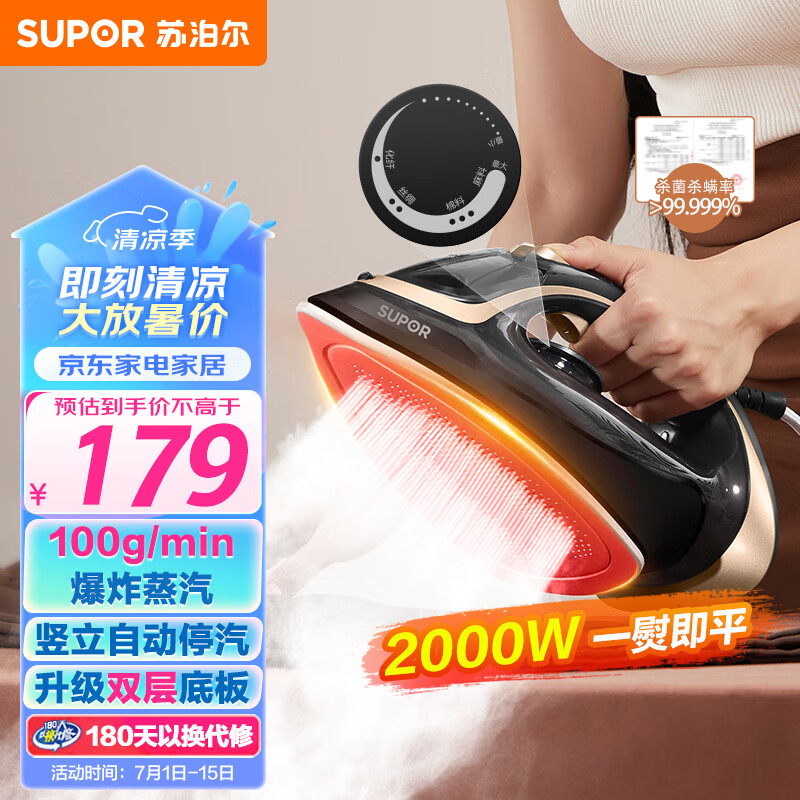苏泊尔(SUPOR)蒸汽电熨斗2000W家用便携式手持蒸汽挂烫机三档蒸汽自动清洗升级双层底板小型熨烫机ESP-302A 价格:179.00元!