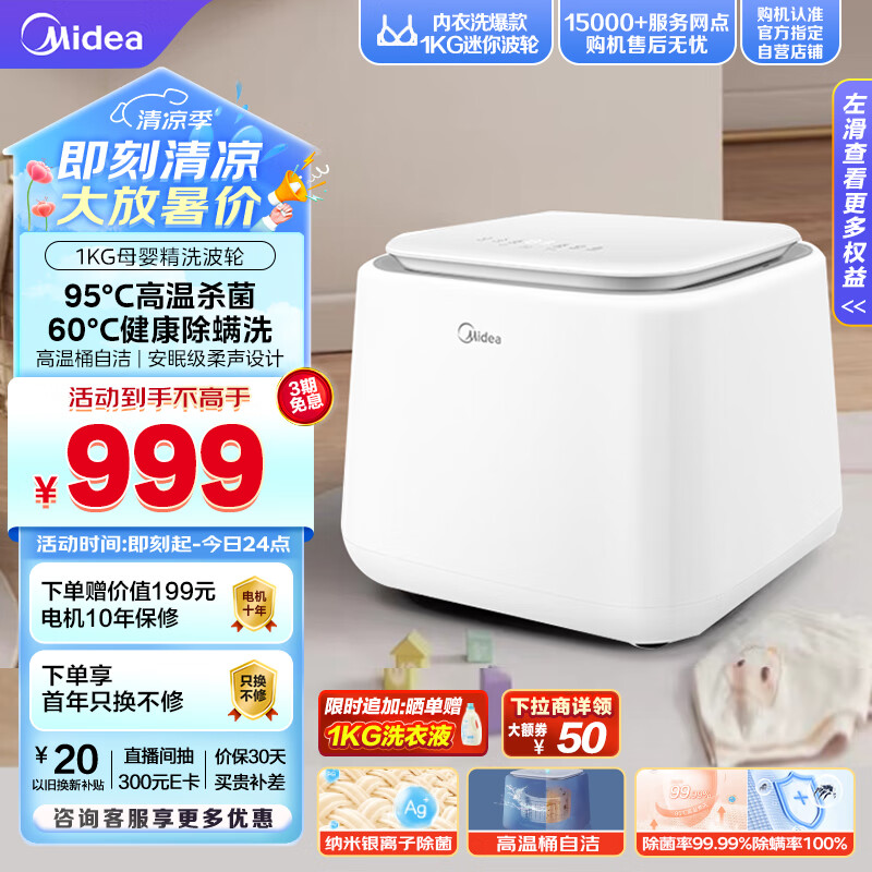 美的(Midea)1KG迷你洗衣机全自动 内衣裤洗衣机小型 迷你洗衣机 婴儿洗衣机 95℃除菌净螨 MNB10VA0WE价格:999.00元!