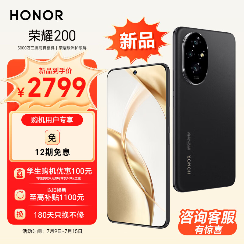 荣耀200 新品 旗舰级青海湖电池 绿洲护眼屏 5000万雅顾光影主摄 拍照手机 AI手机 16+256 绒黑色 5G价格:2799.00元!
