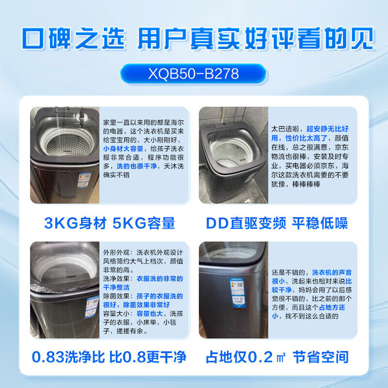 不少朋友想知道海尔XQB50-B278{型号2}感觉都挺好的啦,操作方便,方便快捷,这个海尔XQB50-B278,这款海尔XQB50-B278还挺好的,客服的服务真的很好,回答问题耐心细致,让我感到很贴心。