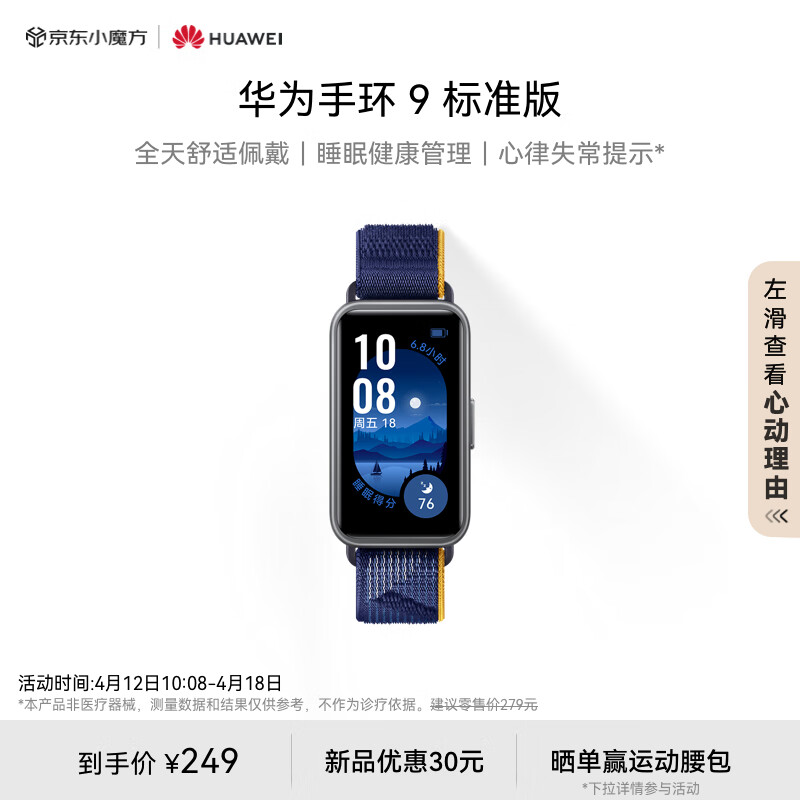 华为(HUAWEI)【新品火爆,陆续发货中】华为手环9 标准版 智能手环 静谧蓝 轻薄舒适睡眠监测心律失常提示价格:249.00元!