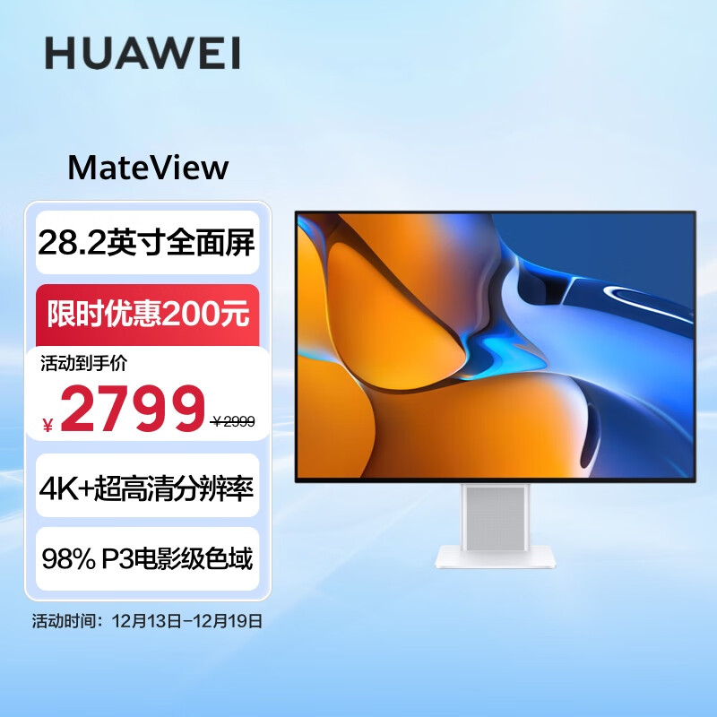 华为HUAWEI MateView显示器28.2英寸 4K+ IPS 98% P3色域 HDR400 TypeC 65W 内置音箱 低蓝光无频闪 电脑办公价格:2799.00元!