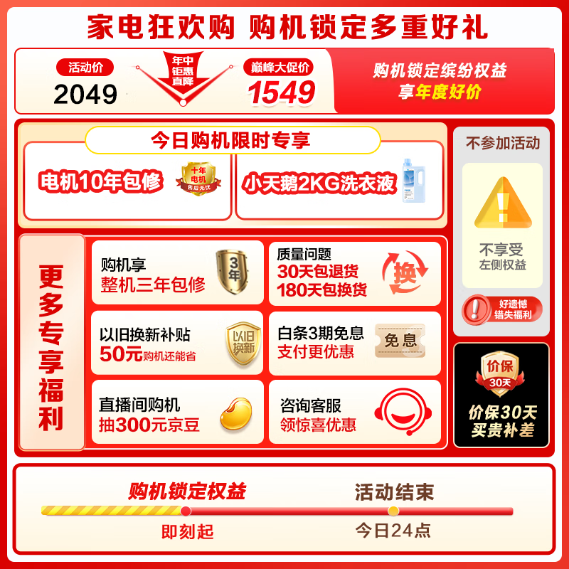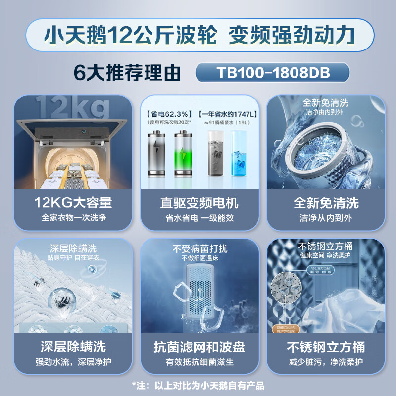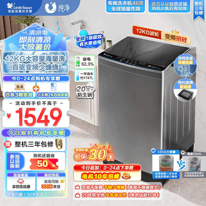小天鹅(LittleSwan)波轮洗衣机全自动 12公斤大容量 直驱变频 免清洗不脏桶 健康除螨洗 以旧换新 TB120-1808DB价格:1549.00元!