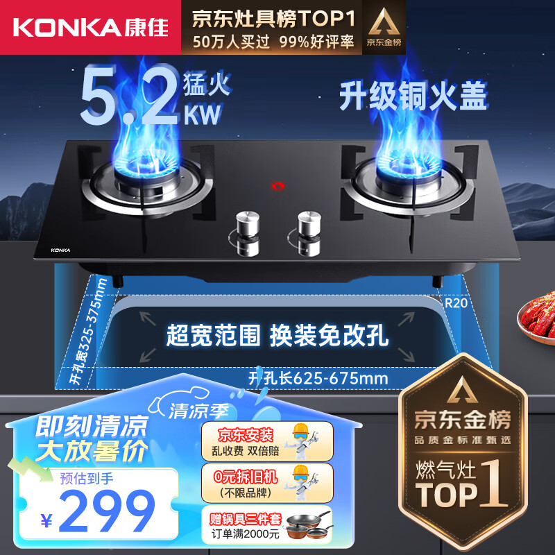 康佳(KONKA)燃气灶煤气灶双灶家用 5.2kW天然气嵌入式台式双灶具 玻璃面板煤气炉灶台JZT-B500Y(天然气)价格:299.00元!