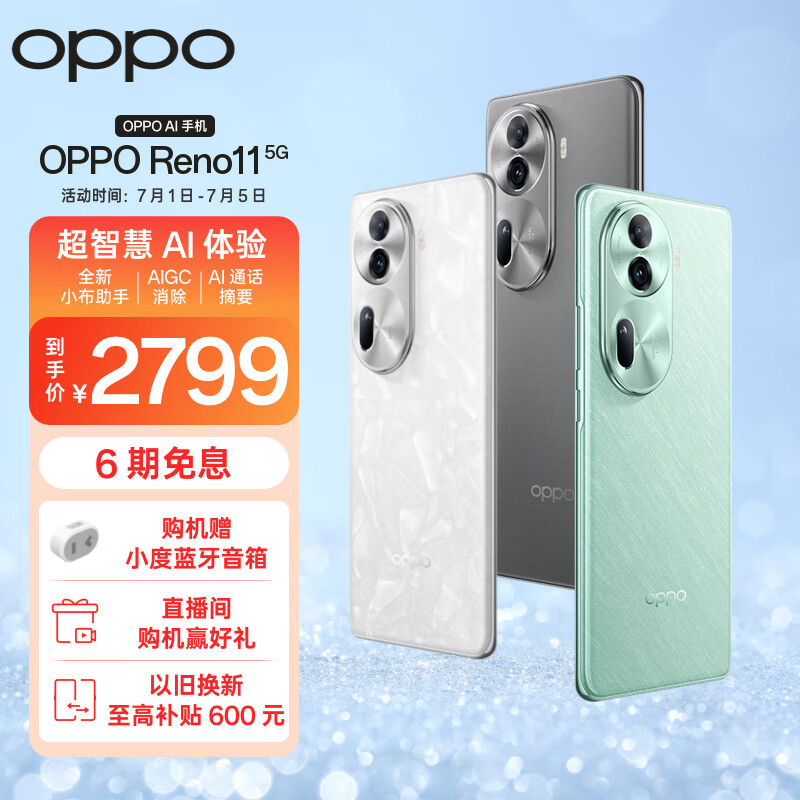 OPPO Reno11 5000万单反级人像三摄 天玑 8200 旗舰芯 长续航 12GB+512GB 月光宝石 学生5G拍照 AI手机价格:2799.00元!